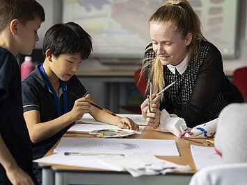 Wir möchten, dass Ihr Kind nicht nur Wissen erwirbt, sondern mit Freude selbstständig lernt und die Welt entdeckt. Unsere Lehrkräfte gestalten den Unterricht lebendig und praxisnah – ob durch Gruppen- und Projektarbeiten oder spannende Ausflüge zu außerschulischen Lernorten wie Museen, Theater oder Workshops.